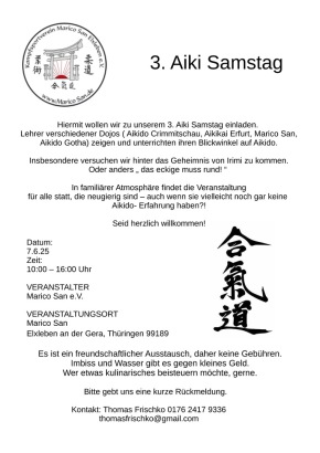 wir laden euch herzlich zu einem besonderen Aikido-Event am 07. Juni 2025 ein. Thomas Frischko vom Marico San e.V. hat ein einzigartiges Aikido-Treffen organisiert, bei dem erfahrene Lehrer aus verschiedenen Dojos ihr Wissen und ihre Techniken teilen.